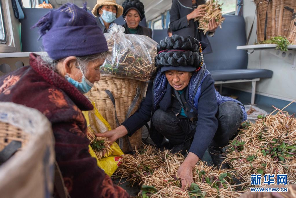 在5633次列車(chē)上的“流動(dòng)集市”,一名彝族婦女(前右)在挑選折耳根(4月11日攝)。新華社記者 胥冰潔 攝