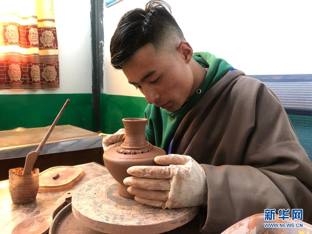 青海省玉樹(shù)藏族自治州囊謙縣吉曲鄉(xiāng)山榮村村民在扶貧產(chǎn)業(yè)園內(nèi)制作黑陶(2020年7月4日攝)。