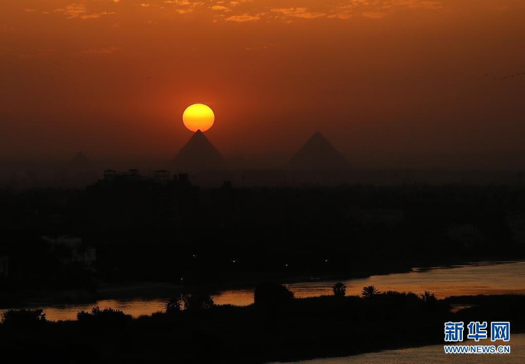 這是4月14日從埃及開羅拍攝的吉薩金字塔群日落景色。新華社記者 王東震 攝