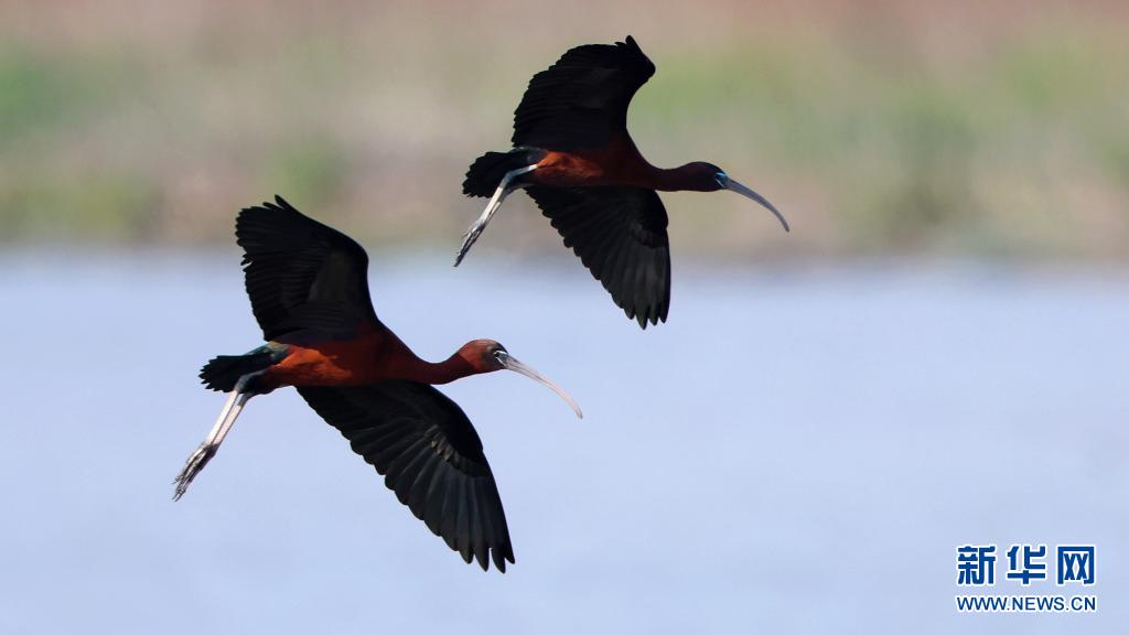 彩鹮在福建省霞浦縣福寧灣灘涂上空飛翔(4月17日攝)。一對(duì)彩鹮近日現(xiàn)身福建省霞浦縣福寧灣灘涂的視頻,經(jīng)當(dāng)?shù)孛襟w播發(fā)后引起轟動(dòng),各地?cái)z影師及當(dāng)?shù)厣鷳B(tài)保護(hù)志愿者紛至沓來,一睹它們的“芳容”。新華社記者 梅永存攝