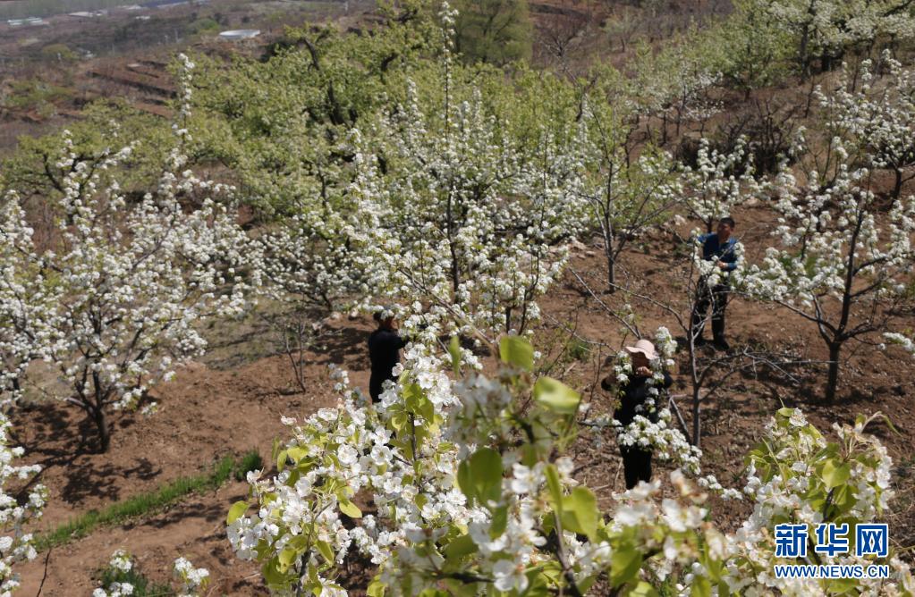 4月19日,農(nóng)民在河北省承德縣新杖子鎮(zhèn)葦子峪村梨園為梨樹疏花。
