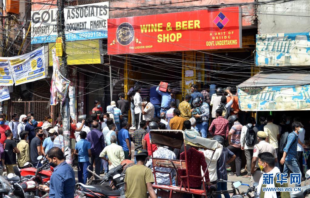 4月19日,印度新德里居民在全城實(shí)施封鎖前搶購酒品。