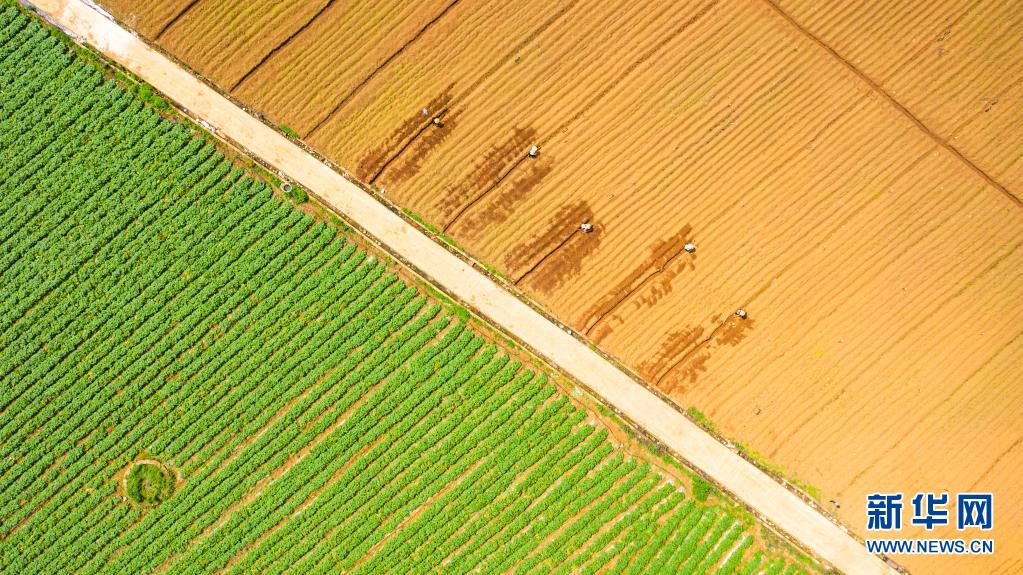 4月20日,貴州省六盤水市六枝特區(qū)木崗鎮(zhèn)農(nóng)民在田地里勞作(無人機(jī)照片)。