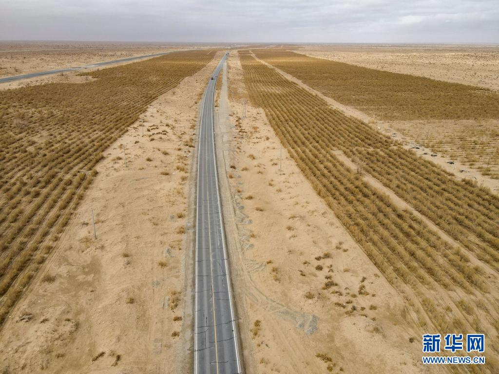 這是且末縣國(guó)道旁種植的生態(tài)梭梭林 (3月31日攝,無(wú)人機(jī)照片)。新華社記者 高晗 攝