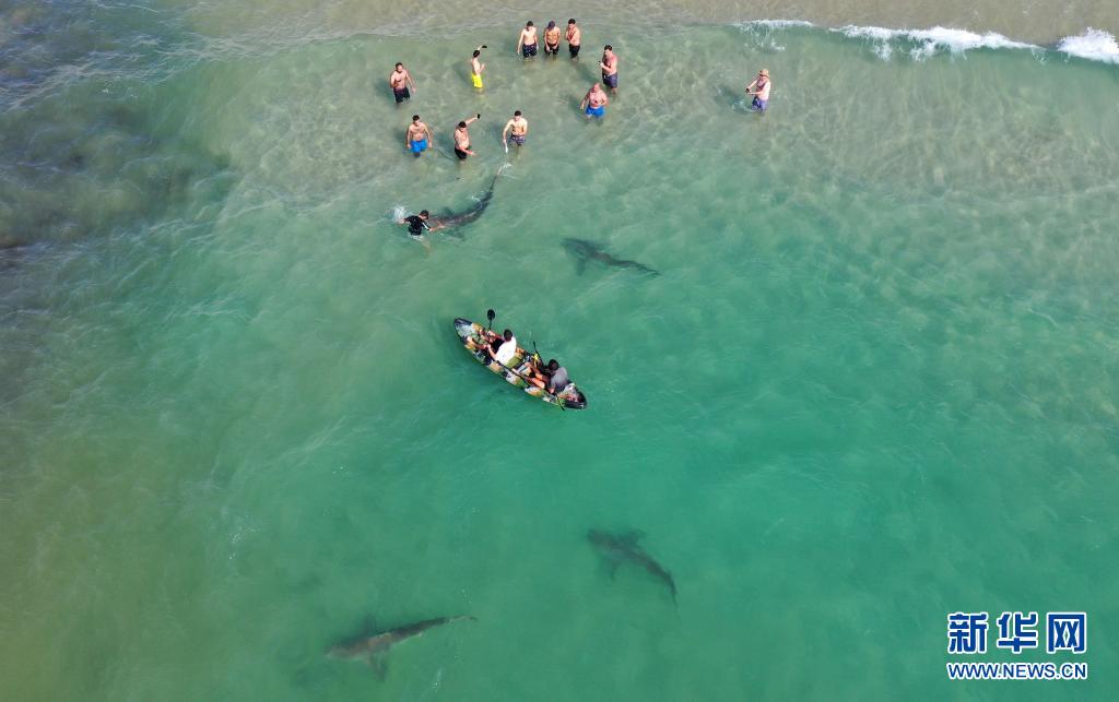 4月20日,在以色列北部城市哈代拉的海邊,鯊魚從人們身邊游過(無人機(jī)照片)。