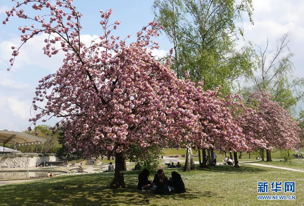 4月21日,人們?cè)诜▏屠枰惶幑珗@的櫻花樹下休閑。