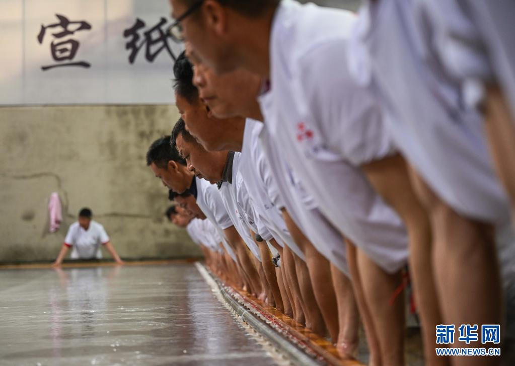 近日,在宣紙產地安徽省宣城市涇縣,“四丈宣紙”的抄制在一家紙業(yè)有限公司啟動。50余名撈紙師傅操作巨型紙簾,齊心協(xié)力,在紙槽旁進行撈紙作業(yè)。來回起落兩次,動作整齊劃一。隨后工人們將紙簾吊起放至一邊揭下,一張巨大的宣紙便撈制成功。經過曬、剪等工序后, 制成長13.2米、寬3.6米的巨型宣紙就是“四丈宣紙”。
