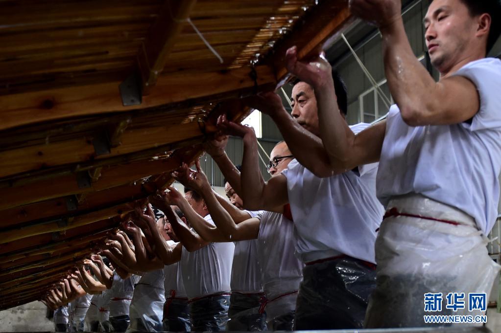 近日,在宣紙產(chǎn)地安徽省宣城市涇縣,“四丈宣紙”的抄制在一家紙業(yè)有限公司啟動。50余名撈紙師傅操作巨型紙簾,齊心協(xié)力,在紙槽旁進(jìn)行撈紙作業(yè)。來回起落兩次,動作整齊劃一。隨后工人們將紙簾吊起放至一邊揭下,一張巨大的宣紙便撈制成功。經(jīng)過曬、剪等工序后, 制成長13.2米、寬3.6米的巨型宣紙就是“四丈宣紙”。