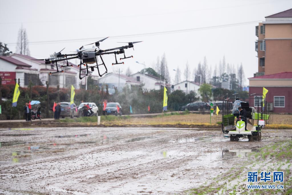 這是3月2日在湖南省益陽(yáng)市沅江市草尾鎮(zhèn)沅江現(xiàn)代農(nóng)業(yè)技術(shù)研發(fā)基地拍攝的一臺(tái)農(nóng)用無(wú)人機(jī)。新華社記者 陳思汗 攝