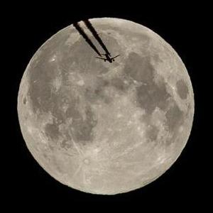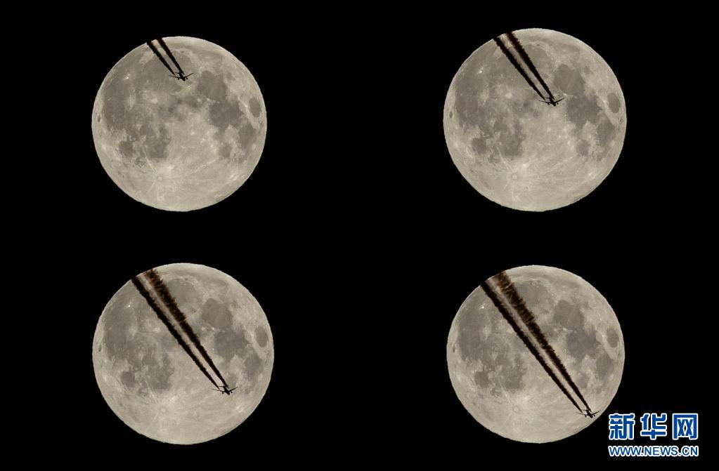4月27日,一架飛機(jī)“飛過”法國巴黎上空的“超級月亮”(拼版照片)。新華社發(fā)(奧雷利安·莫里薩爾攝)