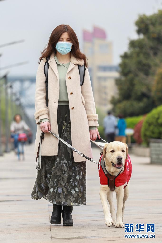 導(dǎo)盲犬“Bingo”陪伴李靜在南京長江邊的景觀帶散步(3月27日攝)?! ⌒氯A社發(fā) (張夢 攝)