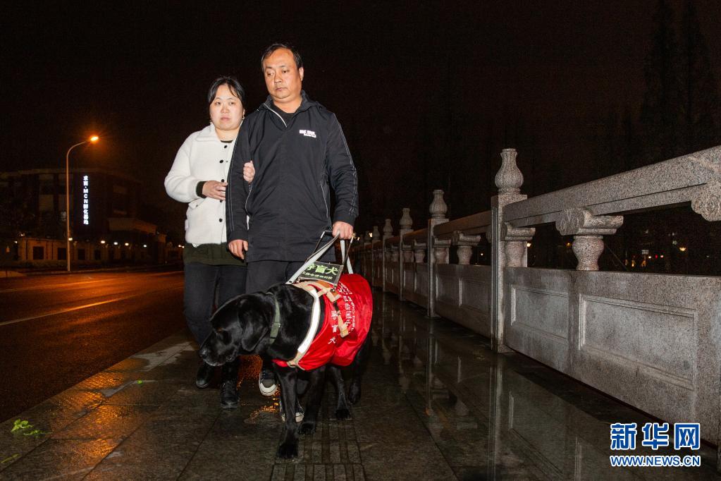 4月11日晚,妻子挽著吳虎剛,吳虎剛牽著“C羅”,共同走在下班回家的路上。 新華社發(fā) (張夢(mèng) 攝)