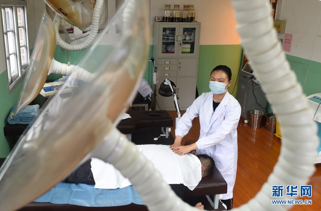 4月28日,葉景芬(前)在自己實習(xí)的龍泉市中醫(yī)院內(nèi)為患者做推拿。新華社記者 韓傳號 攝