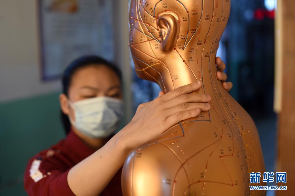 4月28日,葉景芬在自己實(shí)習(xí)的龍泉市中醫(yī)院內(nèi)感受中醫(yī)針灸穴位。新華社記者 韓傳號 攝