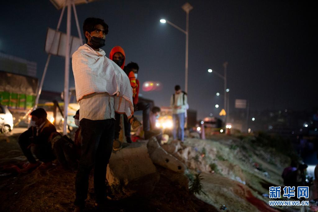 4月28日晚,人們在尼泊爾首都加德滿都的路邊等車,準備在封禁措施實施前離開加德滿都返回家鄉(xiāng)。