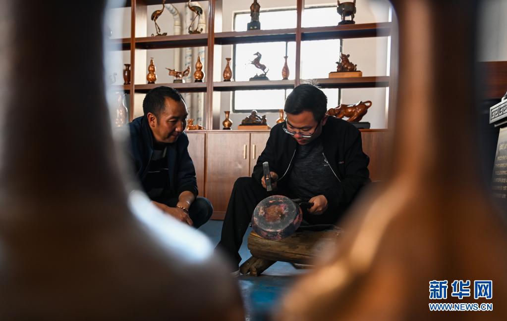 4月26日,張偉(右)在制作斑銅作品。