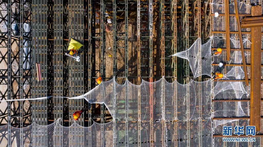 5月1日,在湖北襄陽(yáng)內(nèi)環(huán)線項(xiàng)目跨襄北編組站大橋施工現(xiàn)場(chǎng),中鐵十一局建設(shè)者在進(jìn)行安全防護(hù)網(wǎng)掛設(shè)施工(無(wú)人機(jī)照片)。