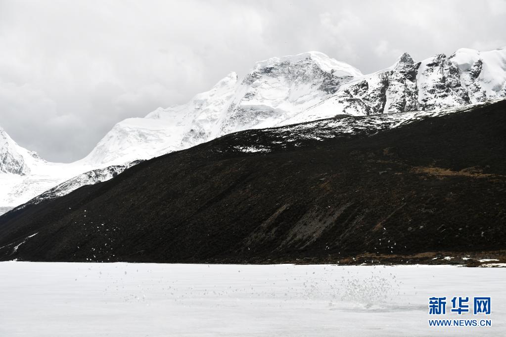 一陣強(qiáng)風(fēng)掠過(guò)薩普雪山腳下的冰湖時(shí)卷起湖面的薄冰(5月4日攝)。