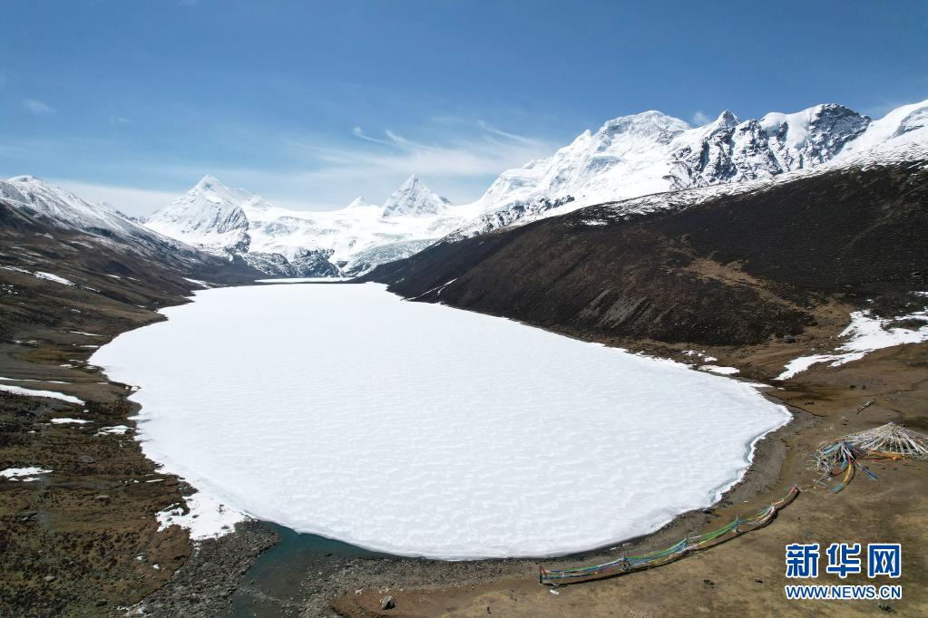 這是5月4日拍攝的薩普雪山和雪山腳下的冰湖(無(wú)人機(jī)照片)。