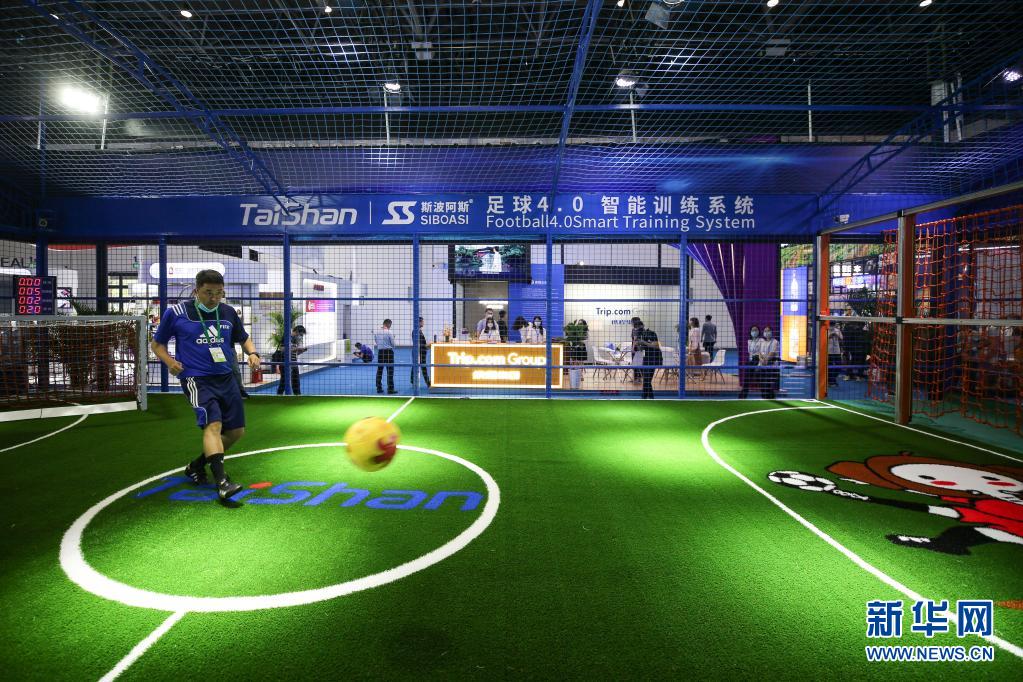 5月7日,參展商在消博會現(xiàn)場演示足球智能訓(xùn)練系統(tǒng)。