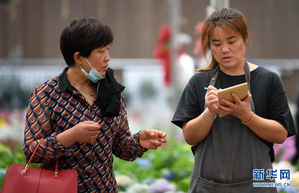 5月7日,在秦嶺花世界現(xiàn)代農(nóng)業(yè)園區(qū),銷售人員在給顧客計(jì)算花卉價(jià)格。
