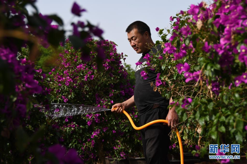 5月7日,在秦北世紀(jì)花園中心,一名園藝工人在為三角梅澆水。