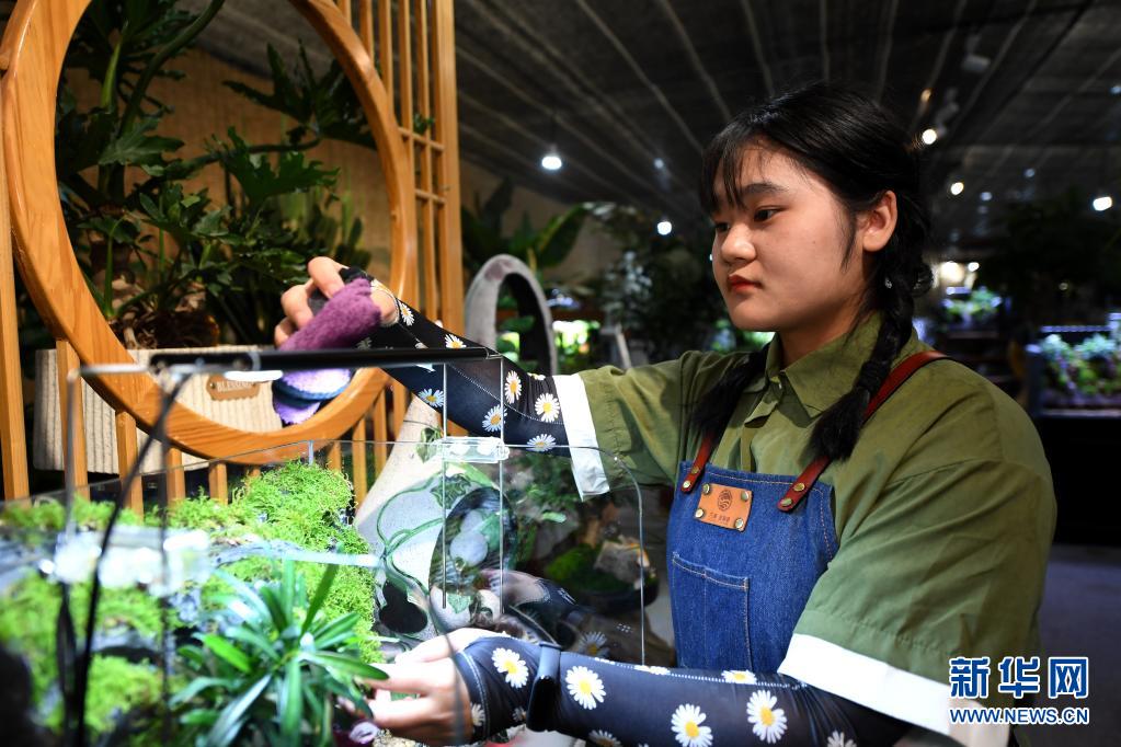 5月7日,在秦嶺花世界現(xiàn)代農(nóng)業(yè)園區(qū),花藝師韓佳馨在對(duì)盆景進(jìn)行清潔養(yǎng)護(hù)。