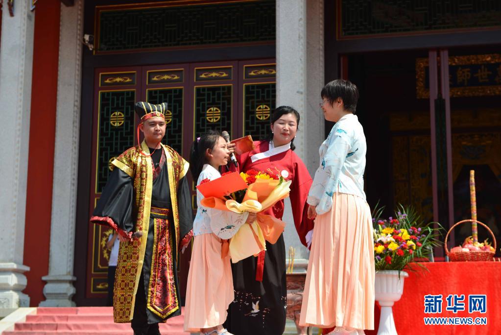 5月9日,在廣西賀州市八步區(qū)賀街鎮(zhèn)的賀州文廟國學(xué)教育基地,一名小女孩在母親節(jié)“孝行天下”活動(dòng)中向母親獻(xiàn)花。