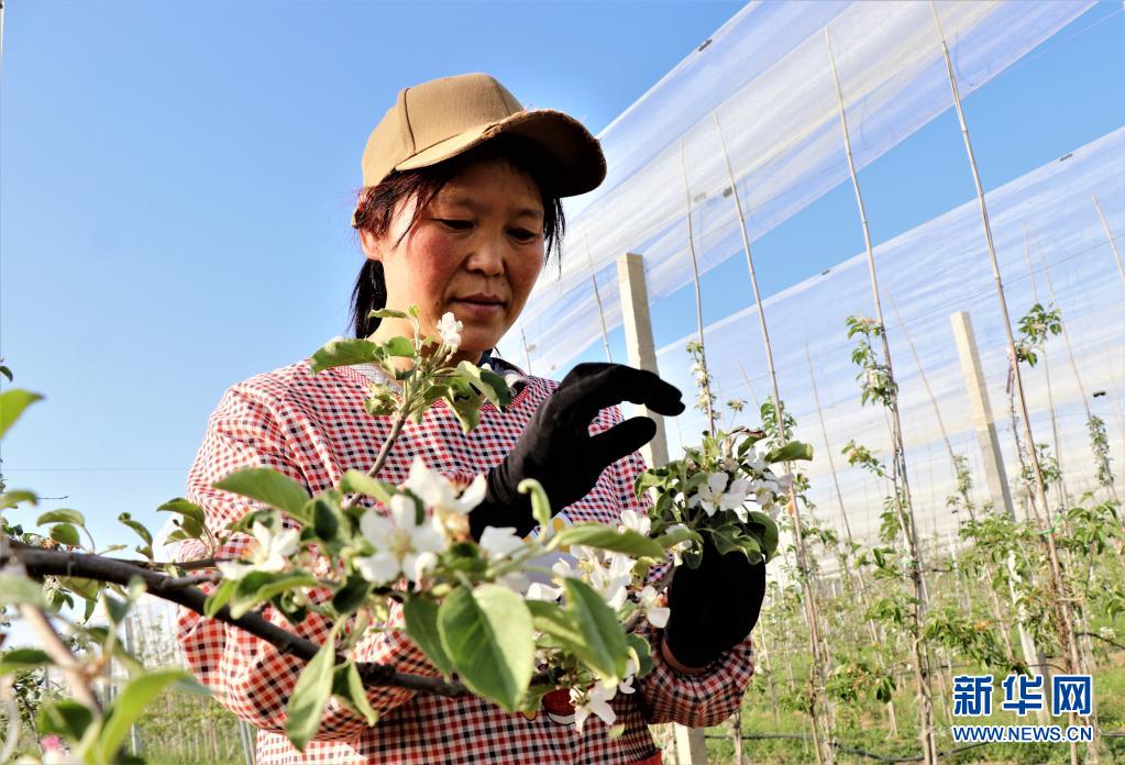 5月9日,在甘肅省平?jīng)鍪徐o寧縣城川鎮(zhèn)一蘋果有機(jī)示范園里,果農(nóng)在疏花。