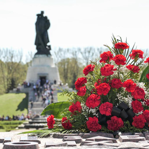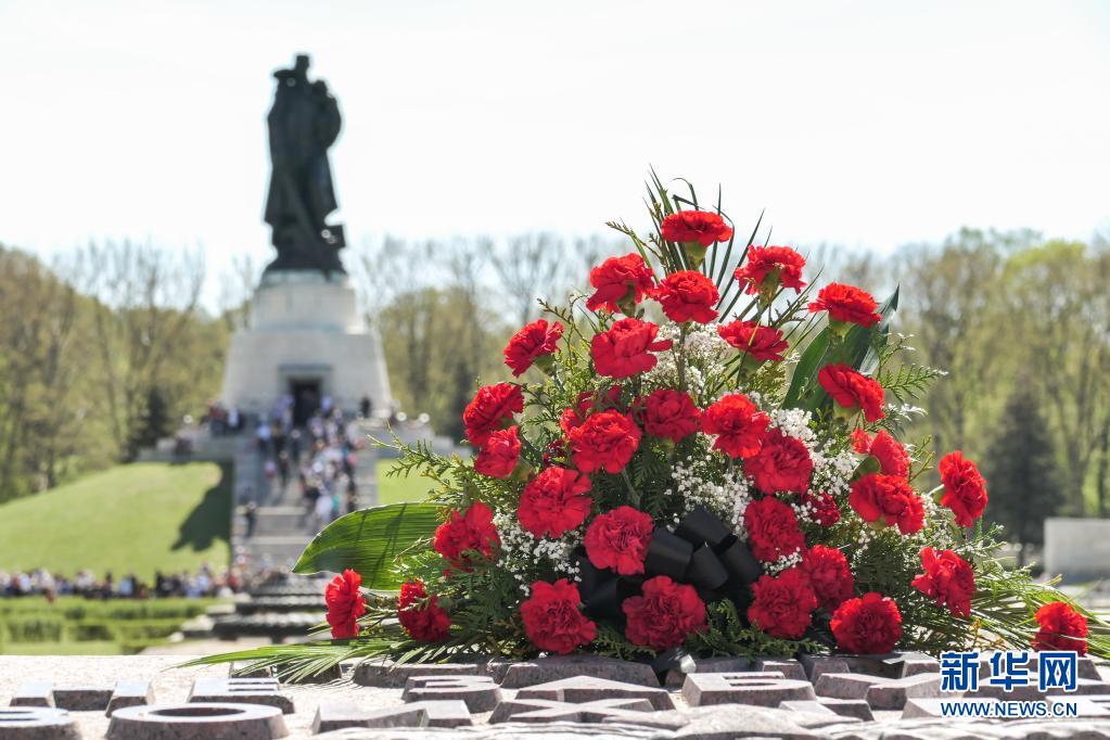 這是5月9日在德國首都柏林特雷普托蘇軍烈士陵園拍攝的花束。