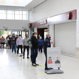 5月10日,人們在愛爾蘭首都都柏林一家重新恢復(fù)營業(yè)的理發(fā)館外排隊(duì)。