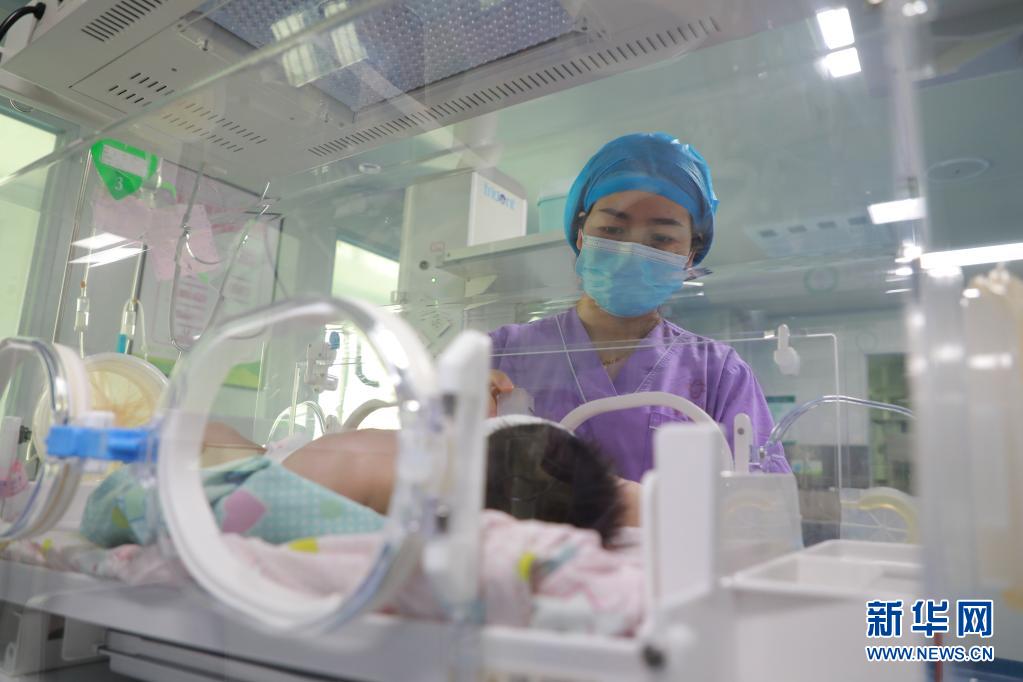 5月11日,湖南省永州市東安縣人民醫(yī)院新生兒科護(hù)士為新生兒進(jìn)行日常護(hù)理。