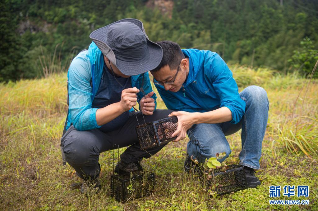 5月12日,南京環(huán)境科學(xué)研究所研究員雍凡(左)與參與此次調(diào)查的助理劉煜坤觀察誘捕籠內(nèi)的動(dòng)物活動(dòng)痕跡。