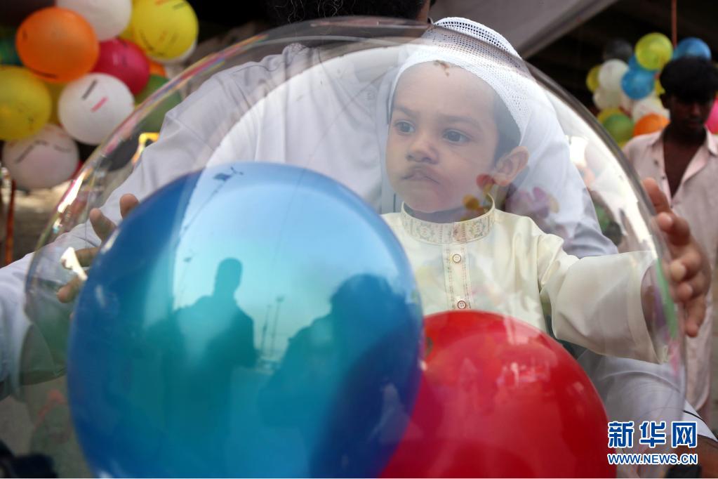 5月13日,在巴基斯坦南部城市卡拉奇,一名兒童在開(kāi)齋節(jié)慶?;顒?dòng)上玩氣球。新華社發(fā)
