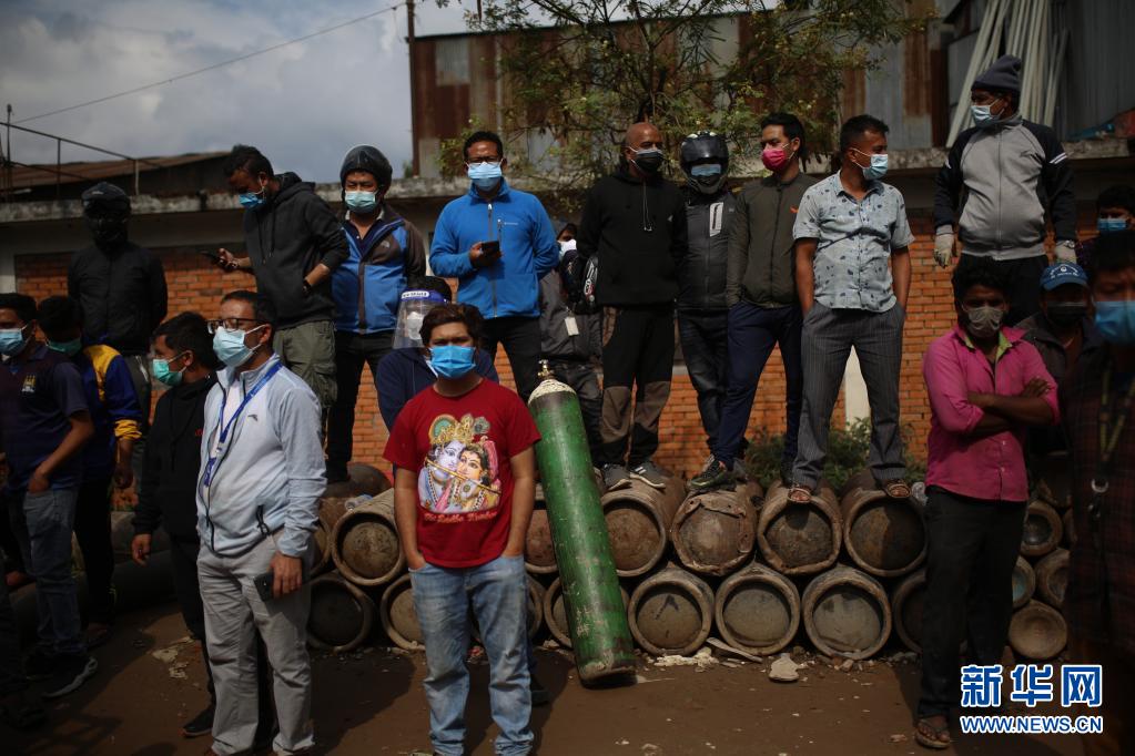 5月13日,尼泊爾民眾在加德滿都等待為氧氣罐充氧。