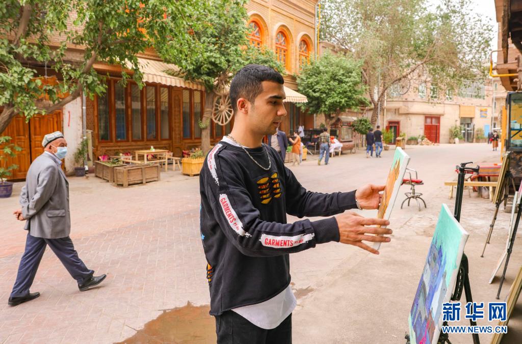 麥麥提吐?tīng)栠d江·麥麥提依明把畫(huà)好的作品擺放到工作室外的展架上,路過(guò)的行人被他的畫(huà)作吸引(5月5日攝)。新華社記者 胡虎虎 攝