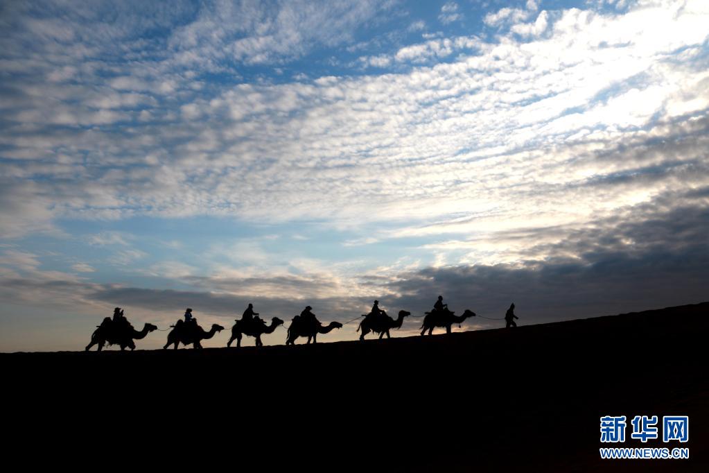 5月15日,游客騎駱駝在甘肅省敦煌市鳴沙山月牙泉景區(qū)游覽。晨光下,云彩、沙山、駝隊構(gòu)成了一幅美麗迷人的畫卷。新華社發(fā)(張曉亮 攝)