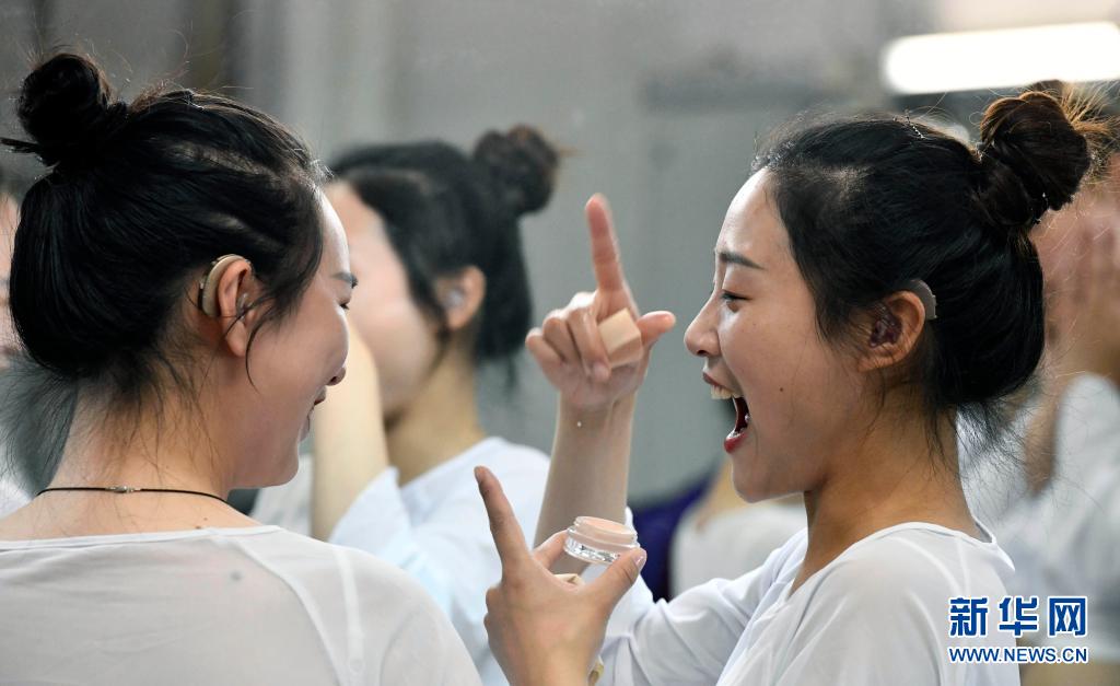 天津理工大學(xué)聾人工學(xué)院的舞蹈隊(duì)員們?cè)趯W(xué)校的劇場(chǎng)里化妝時(shí)交流(5月10日攝)。新華社記者 趙子碩 攝