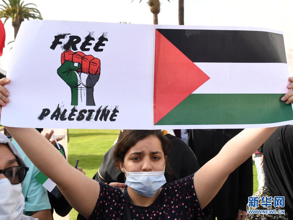 5月15日,一名女子在摩洛哥首都拉巴特參加抗議示威活動,聲援巴勒斯坦民眾。