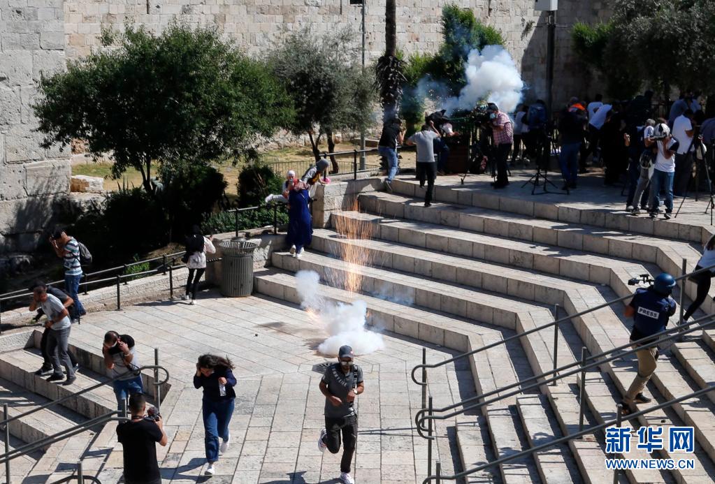 5月18日,巴勒斯坦民眾在耶路撒冷躲避以方發(fā)射的震爆彈。