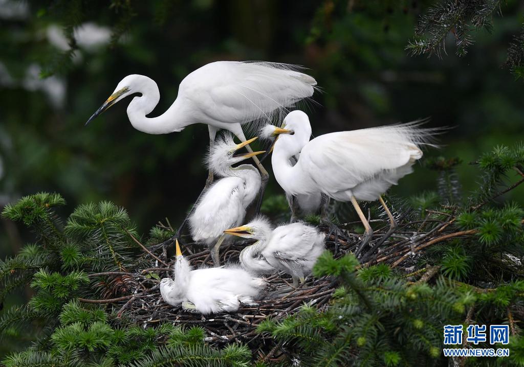 在南昌市新建區(qū)象山森林公園內(nèi),白鷺在給雛鳥喂食(5月18日攝)。