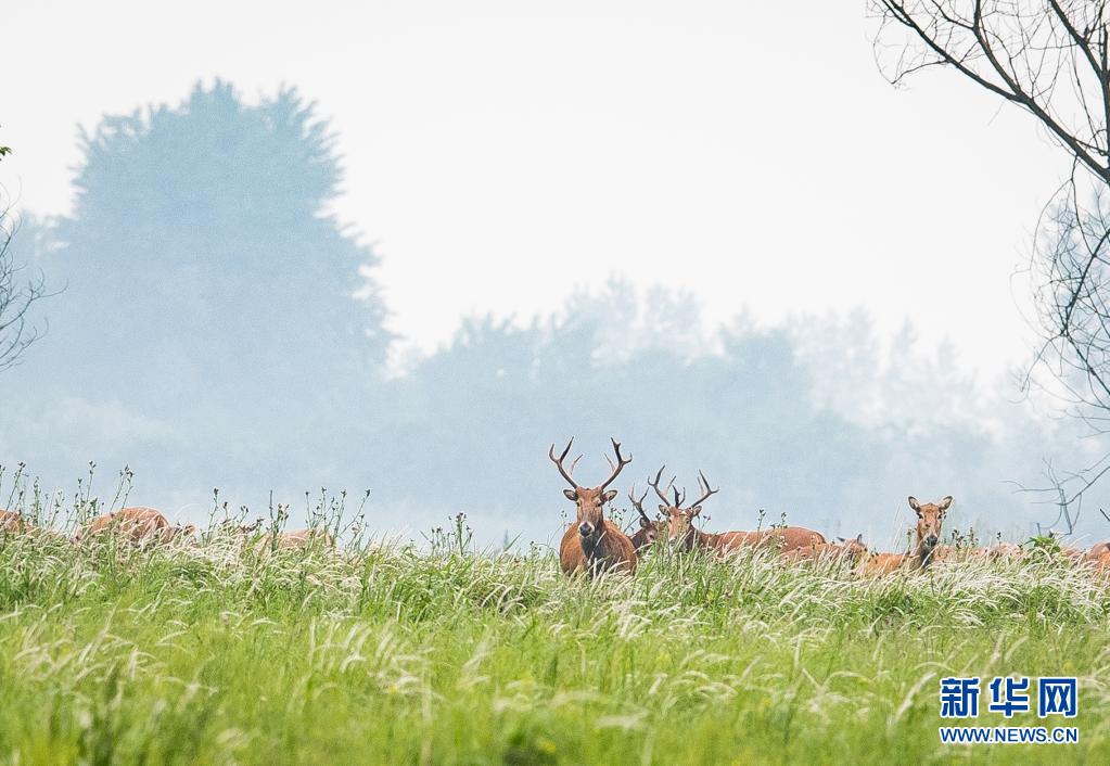 5月17日,一群麋鹿在石首麋鹿國家級自然保護(hù)區(qū)內(nèi)活動(dòng)。新華社記者 肖藝九 攝