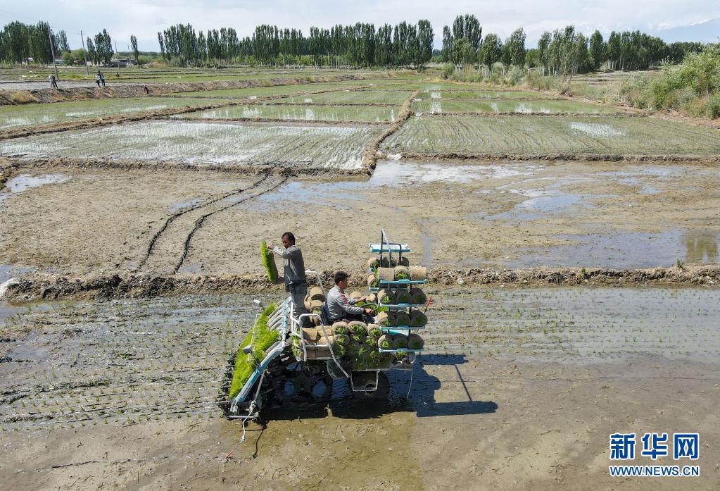 進(jìn)入5月,新疆溫宿縣的11萬余畝水稻進(jìn)入插秧期。稻田間,插秧機(jī)往來穿梭,一片繁忙景象。