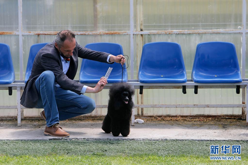5月23日,一名男子在羅馬尼亞首都布加勒斯特為愛犬參加選美比賽做準(zhǔn)備。新華社發(fā)(克里斯泰爾攝)