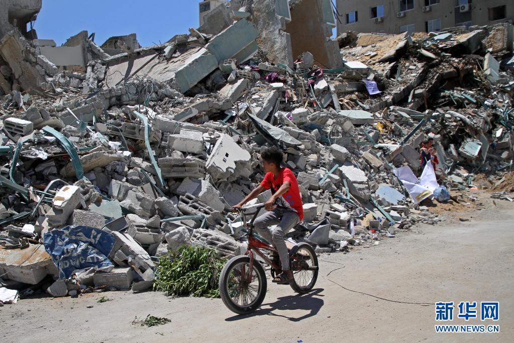 5月23日,一個(gè)男孩在加沙城騎車經(jīng)過遭以軍空襲損毀的賈拉塔。5月10日以來,以色列與加沙地帶武裝組織之間爆發(fā)嚴(yán)重沖突。20日晚,哈馬斯與以色列方面各自宣布,雙方已達(dá)成?;饏f(xié)議,?;饛?1日凌晨開始。新華社發(fā)(里澤克·阿卜杜勒·賈瓦德攝)
