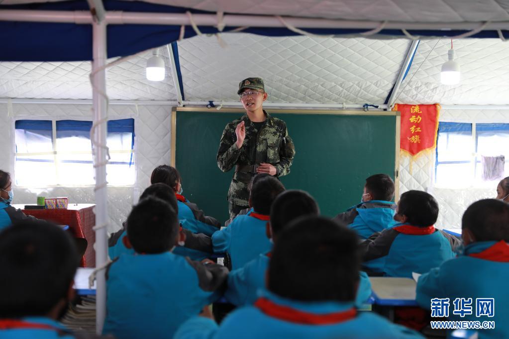 5月24日,武警青??傟牴逯ш牂C(jī)動大隊排長張國睿為花石峽鎮(zhèn)藏文中心寄宿制小學(xué)的孩子上課。新華社記者 劉芳 攝