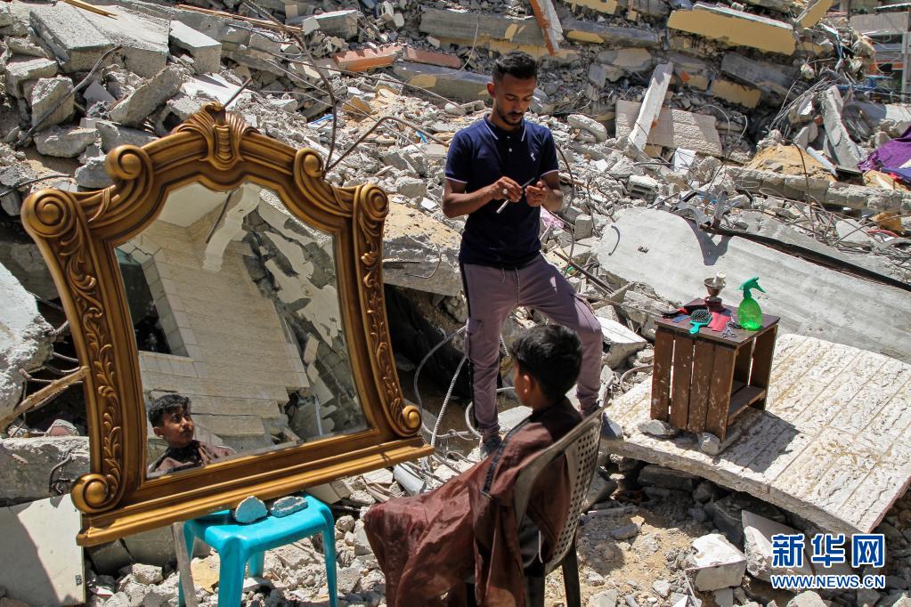 5月26日,在加沙地帶北部的城鎮(zhèn)貝特拉希亞,23歲的巴勒斯坦理發(fā)師阿卜杜拉·扎瓦拉在他被以色列炸毀的房屋前為顧客免費服務?!⌒氯A社發(fā)(里澤克·阿卜杜勒·賈瓦德攝)