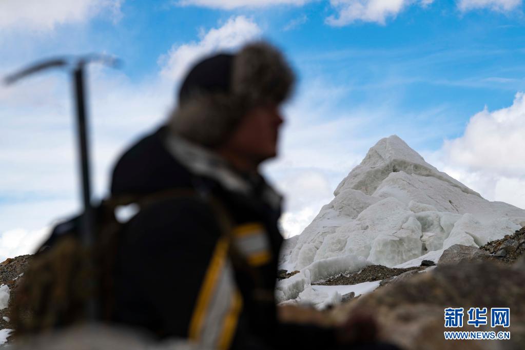 別克米爾扎·圖爾達力在適應性練習中從冰川旁經過(5月16日攝)。新華社記者 胡虎虎 攝
