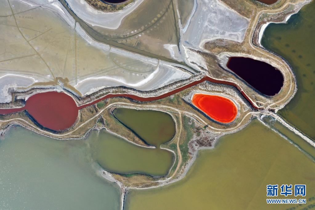 近日,隨著氣溫不斷升高,山西運(yùn)城鹽湖呈現(xiàn)五彩斑斕的景象。