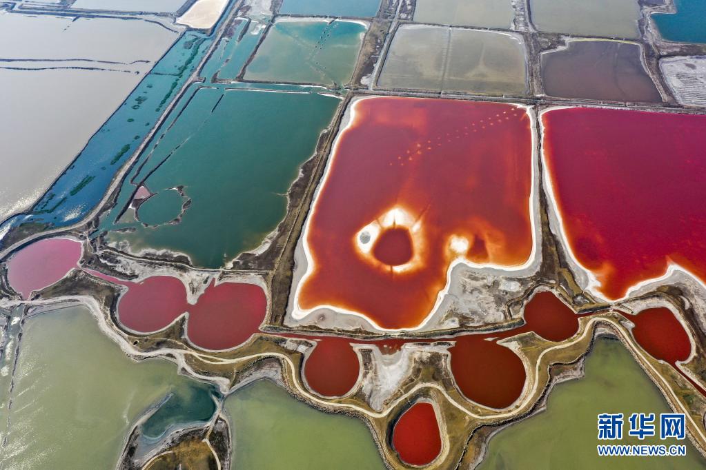 近日,隨著氣溫不斷升高,山西運城鹽湖呈現(xiàn)五彩斑斕的景象。